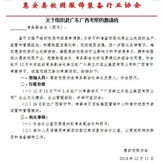 為學(xué)習(xí)和借鑒校服優(yōu)秀企業(yè)先進(jìn)的生產(chǎn)、經(jīng)營(yíng)和管理經(jīng)驗(yàn),構(gòu)建聯(lián)盟發(fā)展機(jī)制,促進(jìn)企業(yè)抱團(tuán)發(fā)展,進(jìn)一步強(qiáng)化品牌意識(shí),推動(dòng)惠安校服行業(yè)創(chuàng)新突破,增強(qiáng)惠安校服的行業(yè)影響力和市場(chǎng)競(jìng)爭(zhēng)力,攜手做強(qiáng)做大惠安校服產(chǎn)業(yè),12月15~17日,惠安縣校園服飾裝備行業(yè)協(xié)會(huì)會(huì)員單位赴廣東、廣西進(jìn)行考察交流活動(dòng)?;顒?dòng)期間先后考察廣東奔立爾集團(tuán)、廣東雅藝服飾、百裕集團(tuán)