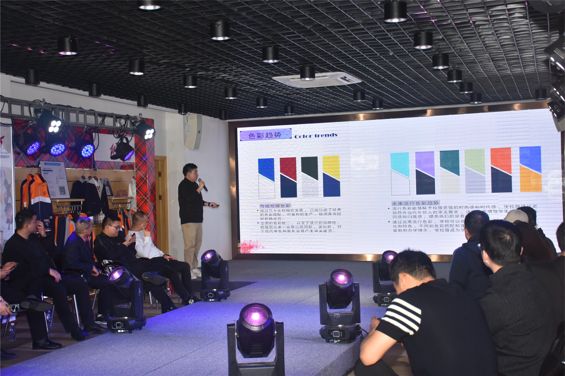 全國(guó)學(xué)生服飾南方研發(fā)中心致力于校服文化與功能的研究,款式設(shè)計(jì)等。以提升整個(gè)行業(yè)品牌推動(dòng)創(chuàng)新為使命,繼而引領(lǐng)校服產(chǎn)業(yè)的升級(jí),打造中國(guó)校服的特色,推進(jìn)中國(guó)校服走向世界,弘揚(yáng)中華民族文化,鑄造民族品牌。研發(fā)中心副總經(jīng)理余朝陽(yáng)從色彩趨勢(shì)、結(jié)構(gòu)趨勢(shì)、面料趨勢(shì)、科技輔料、文化運(yùn)用等方面分享本次新品校服的設(shè)計(jì)理念。